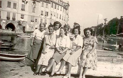 Nonna Adelina a Portofino con le impiegate; da sinistra Elena Besana; nonna Daide; Lola Mantegazza; XX; Orietta e zia Luisa quasi nascoste sul retro; Ancona; Lidia