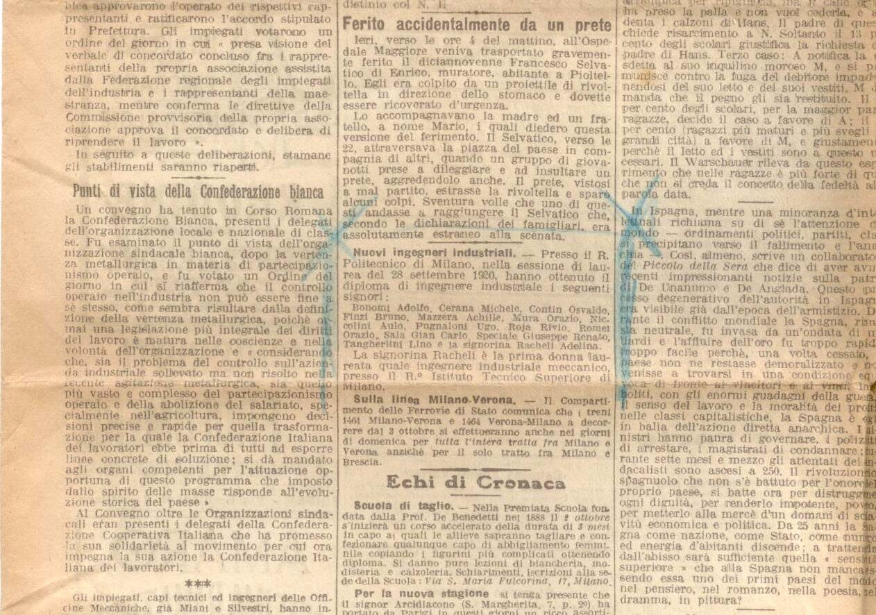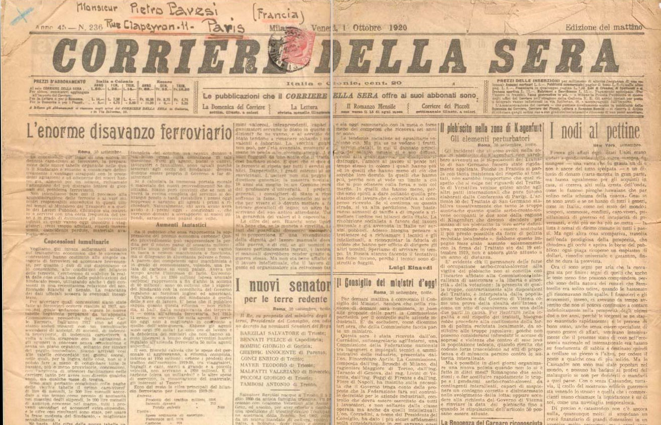 Ritaglio del Corriere Della Sera del 1 Ottobre 1920 dello zio Pietro Pavesi (allora residente a Parigi) con la pagina da lui marcata della laurea della signorina Racheli Adelina: “La signorina Racheli é la prima donna laureata quale ingegnere industriale meccanico presso il Reale Istituto Tecnico Superiore di Milano.”