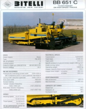 Nel settore delle finitrici la Bitelli proponeva la linea più completa e più accattivante: non meno di quattro finitrici gommate, con pesi a partire da 7 tonnellate fino a 20 e tre cingolate con pesi da 5 a 25 tonnellate!