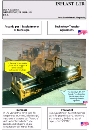 Questa è la prima pagina del contratto che mostra una fotografia del rasatore Niarb "Soft-Action", montato su una tradizionale finitrice. La doppia azione di pre compattatura ("tamping" e vibrazione) e l'insuperato allungamento laterale dei due elementi estensibili idraulici, danno la possibilità di correzione della stesa senza l'aggiunta dei distanziali, dalla larghezza di base fino al doppio della stessa!.