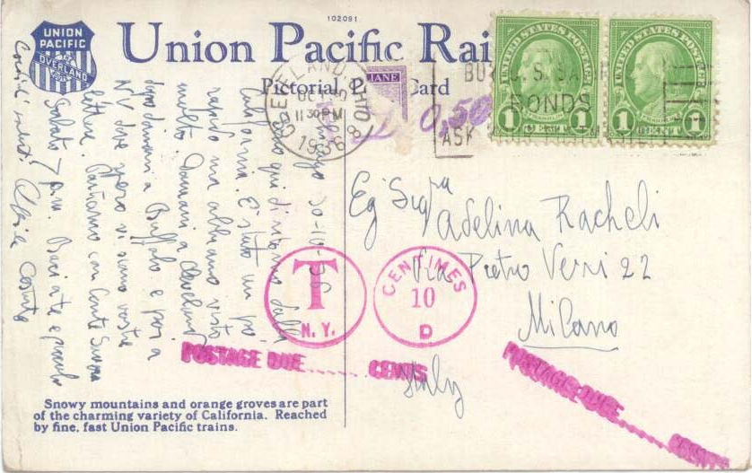 Sono qui di ritorno dalla California. E stato un po' rapido ma abbiamo visto molto. Domani a Cleveland, dopodomani a Buffalo e poi a NY dove spero vi siano vostre lettere. Partiamo con Conte Savora(?) Sabato 7 p.m. Baci a te e piccoli. Costante