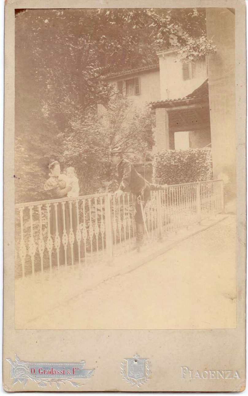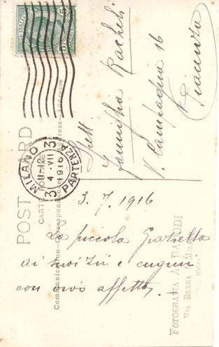 Carissima, la vostra metamorfosi mi è piaciuta assai e mi ci è voluto un pó di tempo prima che vi riconosca. Antonio è irriconoscibile. È quello che ha la tua camicetta con un viso che non assomiglia per niente al suo. Caratteristico è Giuseppe vestito da bebé con le sue forme erculee...Molto carina Rosa, e tu mi sembri un bel monello. Bravi! Ti mando la mia effige fatta l’anno scorso a Bologna; sappiami poi dire se ti piace e se mi assomiglia. Ora desidererei avere un tuo ritratto sola, ma piú in chiaro dell’ultimo che mi mandasti. Addio, cara,