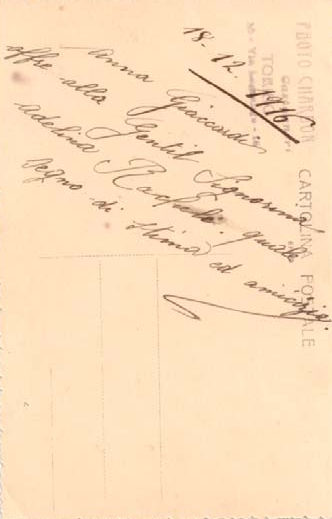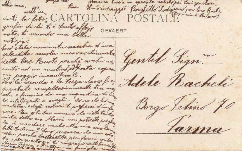 [ un’altra cartolina postale molto sbiadita pare della stessa persona indirizzata alla “Gentilissima Signorina Adelina Racheli, Via XXII Luglio 29, Parma"]