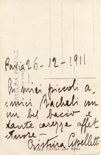 Mia Cara, nell’inviarti la fotografia che ti è tanto affezionata, ti mando una bella notizia. Sono stata nominata maestra d’una scuola nuova, chiamata delle Tre Ruote perché sorta accanto ad un mulino, ed è posta sopra un poggio incantevole. Ho la seconda e la terza classe frequentate complessivamente tra maschi e femmine da una cinquantina di bimbi intelligenti e svegli. Ed ora che ho una scuoletta, e degli scolari ti pregherei d’un favore. Tu o la tua mamma che siete tanto amiche della zia Mariú non potreste pregarla di mandare anche alla mia scuola una bibliotechina? Sono persuasa che una vostra parola basterebbe per farmi contenta; per questo già ti ringrazio sentitamente. Maria Franca e l’intera mia famiglia manda baci e saluti a te e ricevi un nuovo grazie da Pina. Mamma lascia un speciale saluto pei tuoi genitori. Il mio indirizzo è Borghetto Lodigiano per Tre Ruote (Provincia di Milano)
