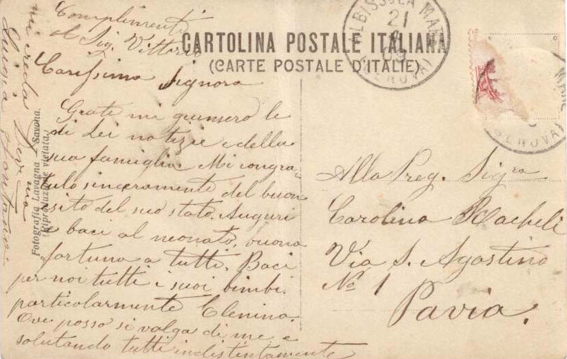 Carissima Signora, grate mi giunsero le di Lei notizie della sua famiglia. Mi congratulo del buon esito del suo stato. Auguri e baci al neonato, buona fortuna a tutti i suoi bimbi, particolarmente Elenina. Ove posso si volga di me e salutando tutti indistintamente. Complimenti al Sig. Vittorio. Mi creda devotissima, Luigia Fontana
